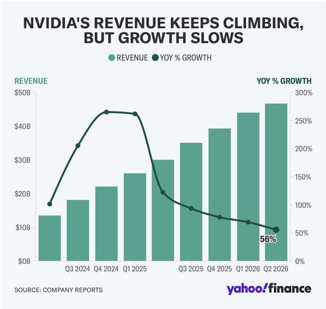 Nvidia reported fiscal 2026 second-quarter revenue of $46.7 billion, up 6% quarter over quarter and 56% year over year, and earnings of $1.05 per share, up 30% sequentially and 54% annually. Wall Street forecast revenue growth of 53% to $46 billion and EPS of $1.01.