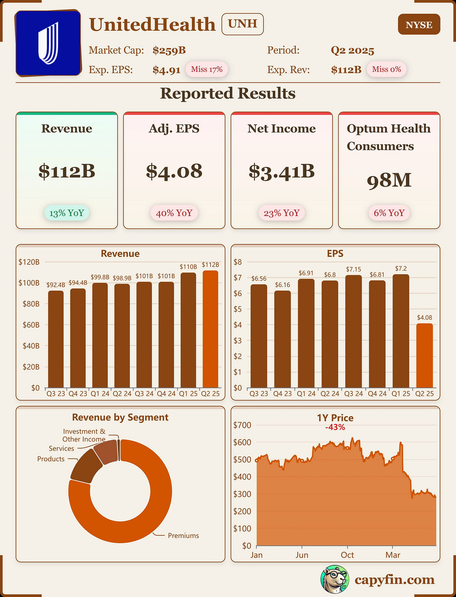 UnitedHealth Group (UNH) reported Q2 adjusted EPS of $4.08 versus the $4.48 Wall Street expected, an 8.9% miss that sent shares down 3%+ in premarket trading. But context matters: this "disappointment" still represents solid profitability on massive scale, and the company's guidance reset provides a more realistic foundation for future beats.