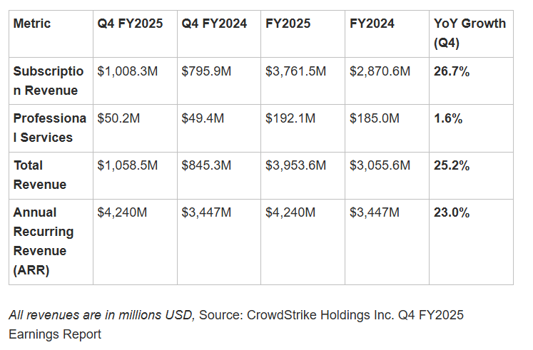 The table shows strong growth across all revenue segments, with subscription revenue representing approximately 95% of total revenue. The company achieved a significant milestone of surpassing $4 billion in ARR, making it the fastest pure-play cybersecurity company to reach this threshold. Professional services revenue showed modest growth as the company continues to focus on its high-margin subscription model.