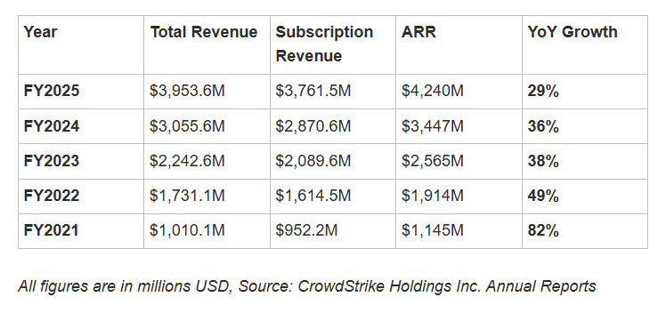 CrowdStrike has demonstrated consistent high-growth trajectory over the past five years, with revenue growing from approximately $1 billion in FY2021 to nearly $4 billion in FY2025. While growth rates have moderated from the extreme highs of earlier years, the company continues to maintain strong double-digit growth well above industry averages.