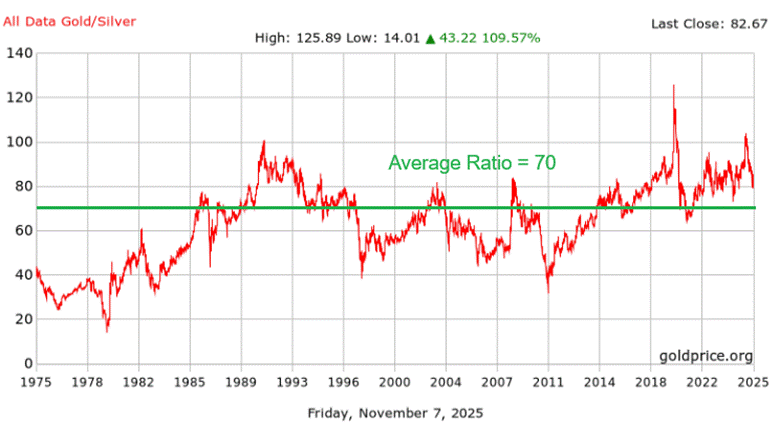 Currently the ratio is at elevated levels of 83:1, which suggests that silver is undervalued when compared to its long-term average of around 60-70. If the ratio reverts to 70, this provides an upside scenario for silver. Assuming the current gold price of $4,000 remains constant, the projected silver price would be around $70.
