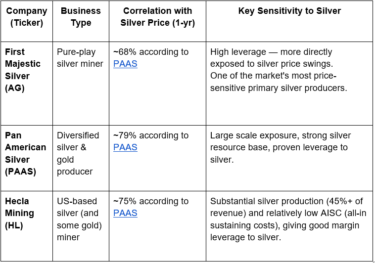 Investors who want exposure to silver can also invest in silver mining companies, which provide leveraged exposure to silver prices. When silver rises, miners’ profits can grow at a faster rate than silver itself, since production costs are relatively fixed while selling prices increase.