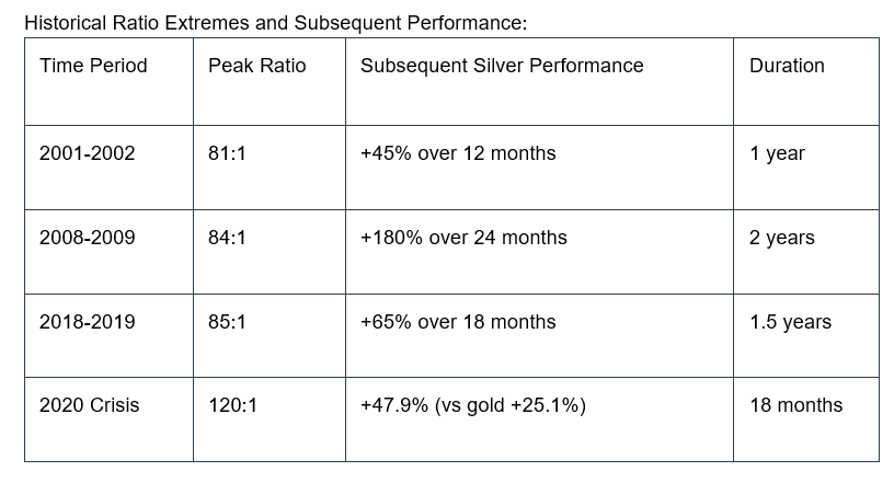 The 2020 period provides particularly compelling evidence. As economic uncertainty peaked, the ratio spiked above 120:1, reflecting investor flight-to-safety behaviour concentrated in gold purchases. Silver initially lagged significantly during this risk-aversion phase.