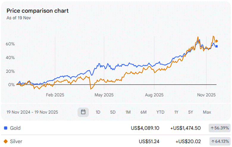 After observing gold’s surge to $4,000, an acquaintance of mine closed all his gold positions and rotated to purchase silver. At that time, silver was trading at $48 and it seemed like a FOMO trade to me. Silver eventually surged to $54 for a brief couple of days, dipped sharply and is now hovering around $51.24 on 19 November.
