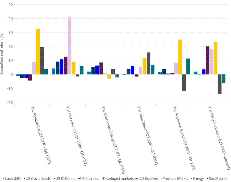 To give you an idea How different assets have performed historically when the dollar fell, here is a chart showing inflation-adjusted annual returns for major periods of dollar weakness since 1973. All figures use US dollars as the base currency and are based on quarterly data.