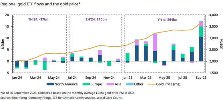 Driven by the various factors mentioned above, Gold ETFs have recorded their largest monthly inflow in September, resulting in the strongest quarter on record. This is mainly driven by North American, followed by Europe and then Asia.