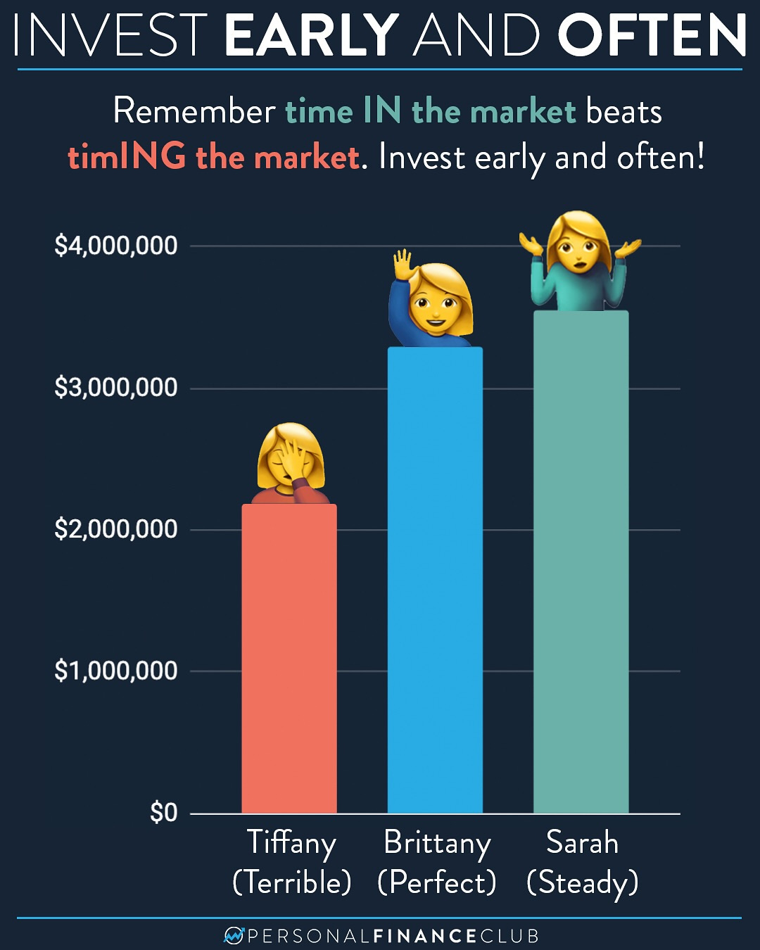 While Brittany was sitting on the sidelines with cash, waiting for each year's perfect moment, Sarah was steadily building her position. The compound growth from being continuously invested more than made up for buying at suboptimal prices.