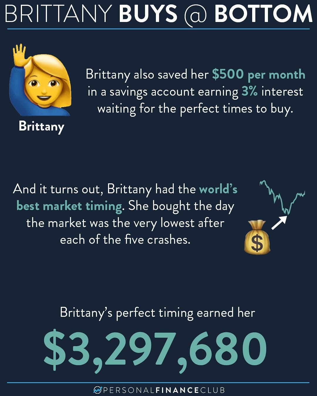 Read that again. Sarah, with her boring monthly contributions, beat even the impossible perfection of Brittany's market timing.