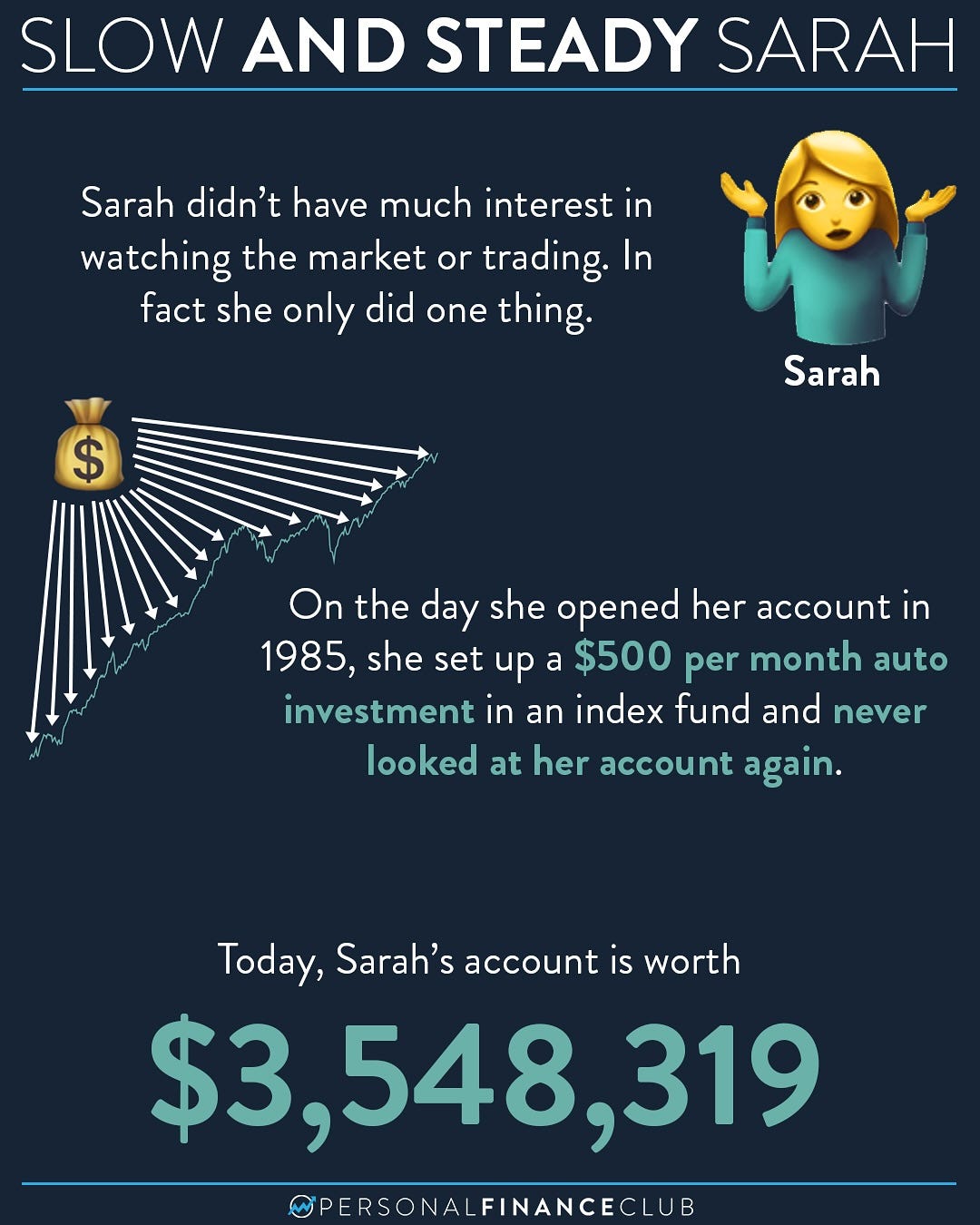 Sarah was the steady tortoise. Every month, rain or shine, market up or down, she automatically invested $200 into her index fund. No analysis, no predictions, no waiting for the "right moment." Just consistent, boring investing.