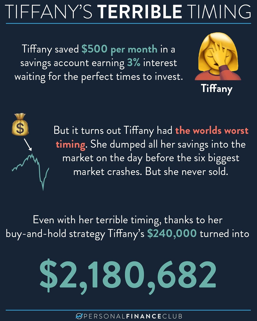 Tiffany had the worst luck imaginable. She also invested $2,000 yearly, but always managed to buy at the absolute market peak, the highest point of each year. Every. Single. Time.