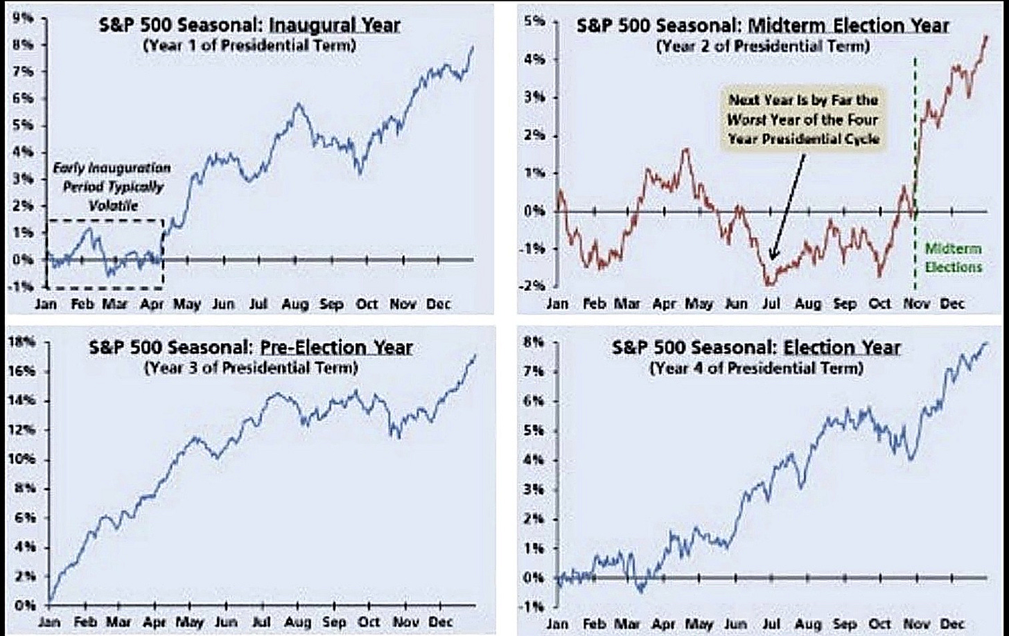 (4) In Midterm years, markets grow the most post-Midterm elections.