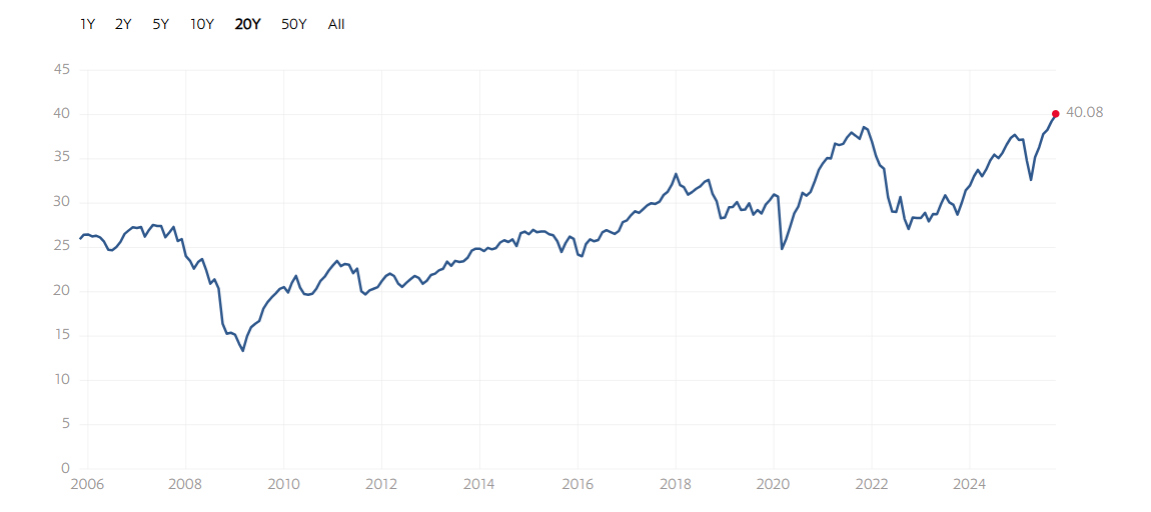 The current reading: The Shiller PE ratio stands at around 40, well above its historical average of about 17. In fact, it’s currently higher than it’s been at any point except the late 1990s dot-com bubble and briefly in 2021.