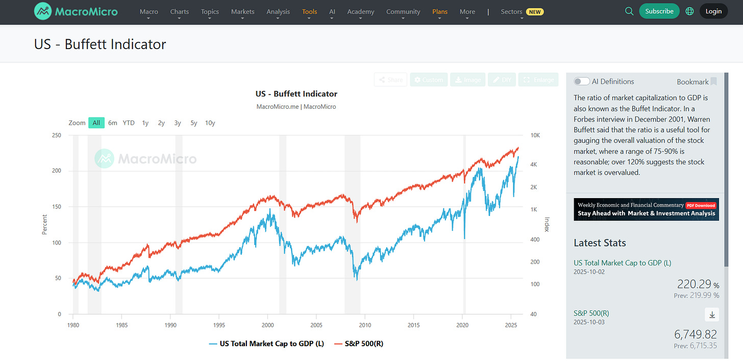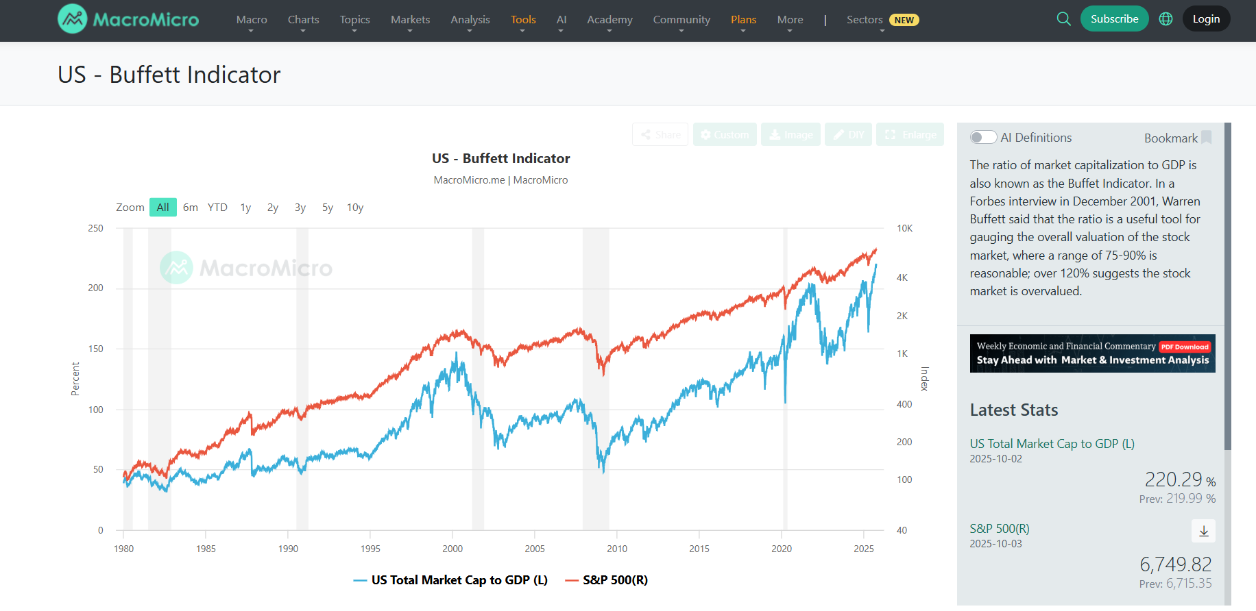 The current reading: The Buffett Indicator currently sits at around 217-220%, meaning the stock market is worth more than twice the size of the annual U.S. economy. That’s roughly 2.2 standard deviations above the historical average.