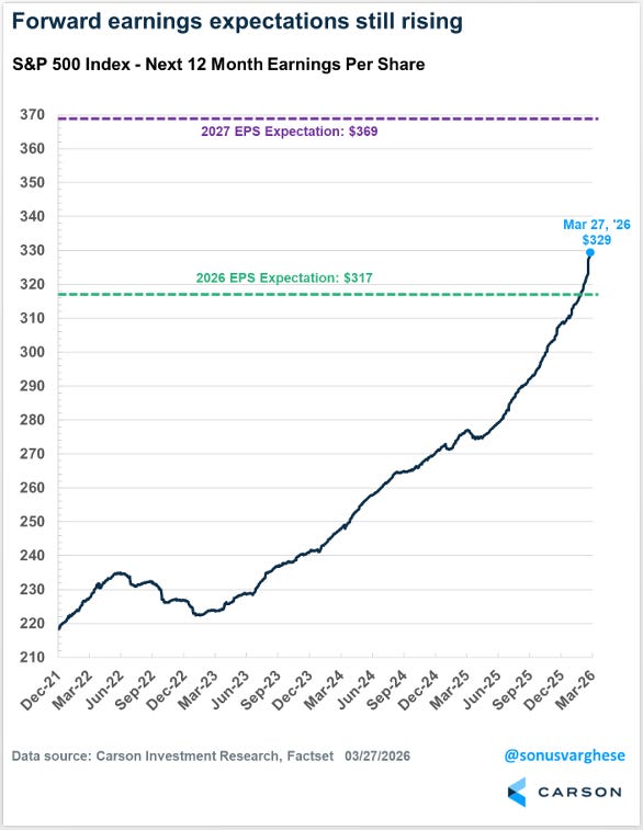 The recent market pullback has been driven almost entirely by valuation drop — investors are simply paying less per dollar of future earnings. It has not been caused by a collapse in those earnings themselves. Forward earnings estimates for the S&P 500 keep rising even as stock prices have wobbled.
