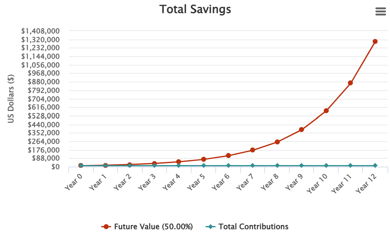 For context, $10,000 invested at 50% annual returns will turn into $1,300,000 in just 12 years.