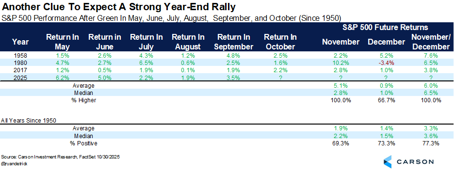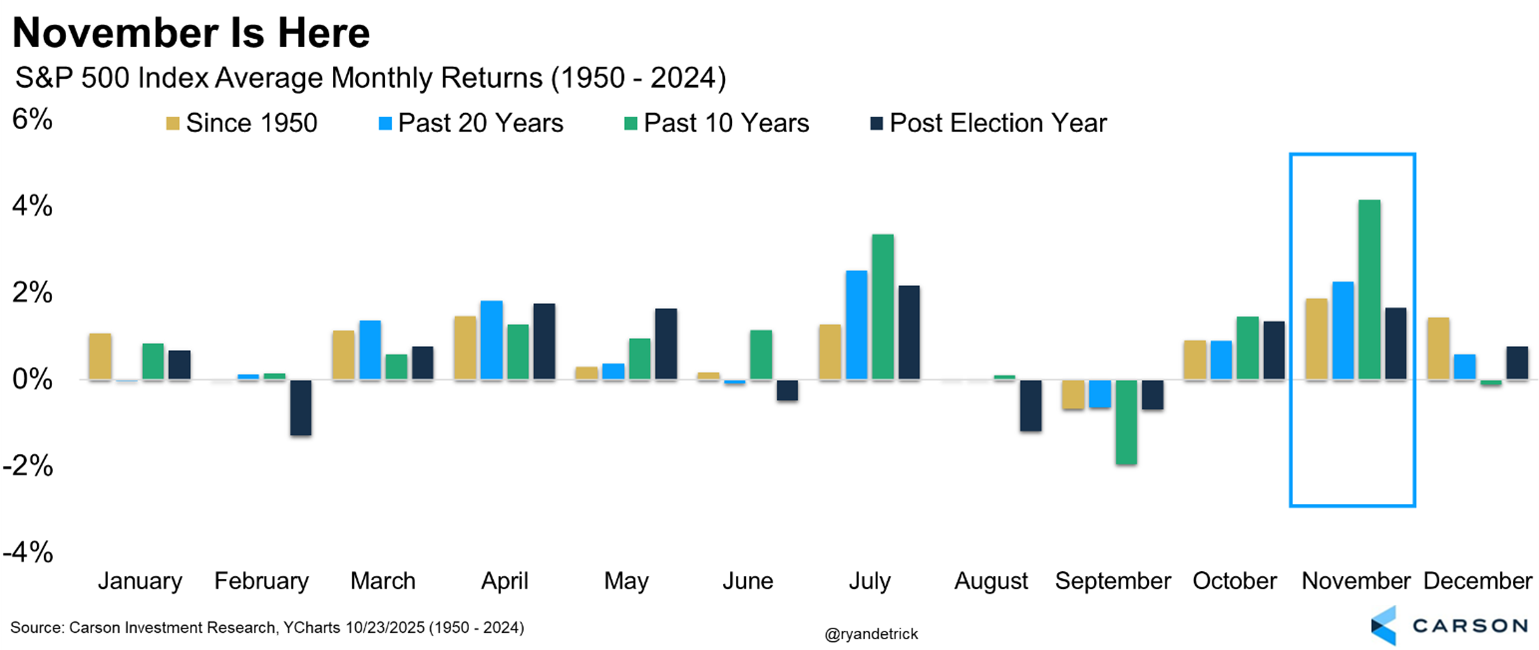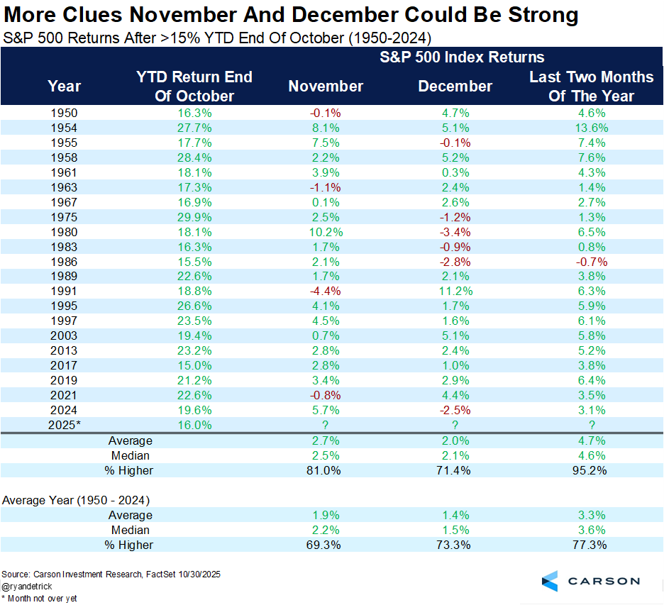 The cherry on top? When the S&P 500 is up more than 15% heading into November (like right now), the eleventh month typically delivers 2.7% gains versus the usual 1.9%. And December tends to follow suit with above-average returns.