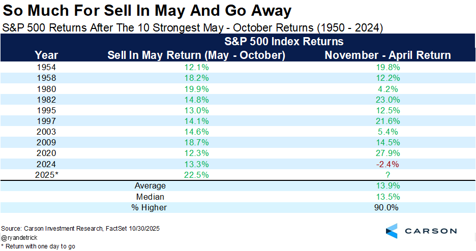When the typically weak months perform this well, history shows the strong months ahead tend to be even better. In the 10 best “Sell in May” periods, the following six months were up 9 out of 10 times, averaging a 13.9% gain—nearly double the typical return.